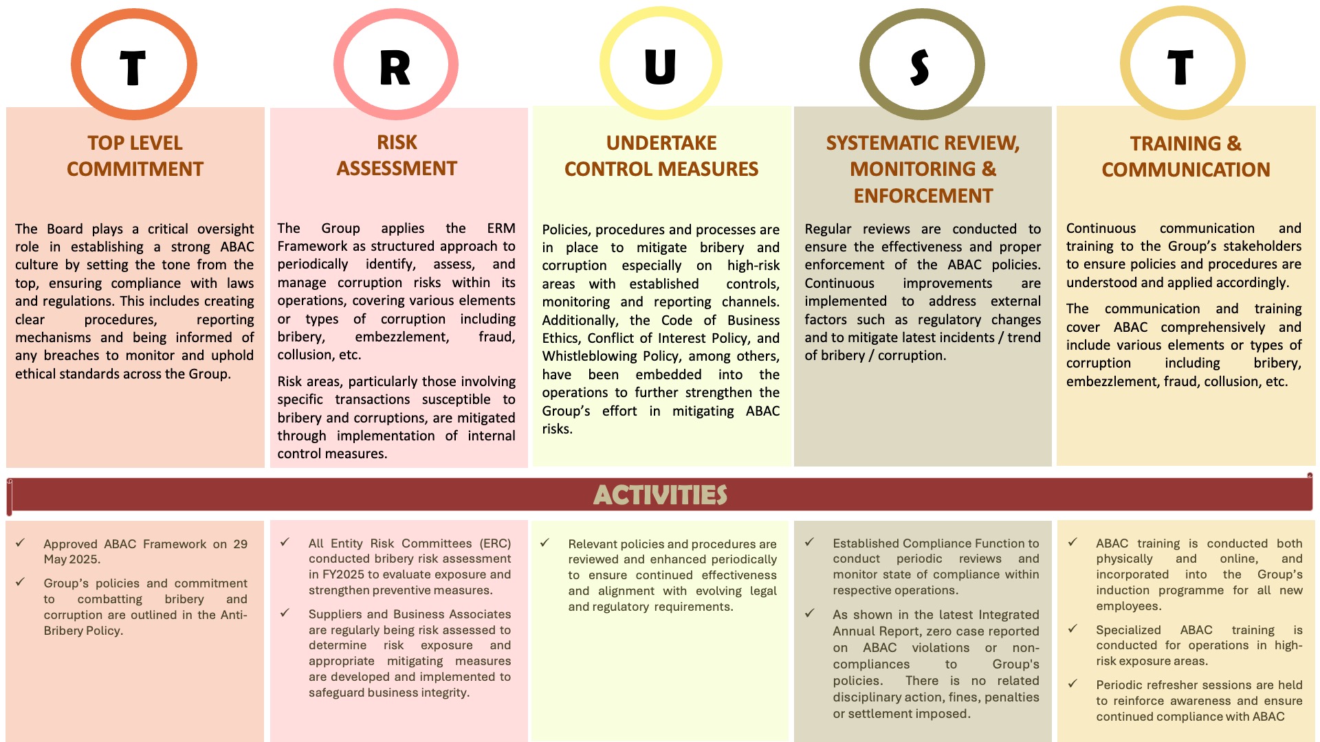 The ABAC Framework is underpinned by the ABAC Policy, which reinforces the Group’s Zero-Tolerance stance against bribery and corruption. It sets clear expectations for ethical conduct, outlines procedures for identifying and managing bribery and corruption risks, and reaffirms our commitment to full compliance with all applicable laws on bribery and corruption.